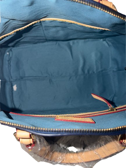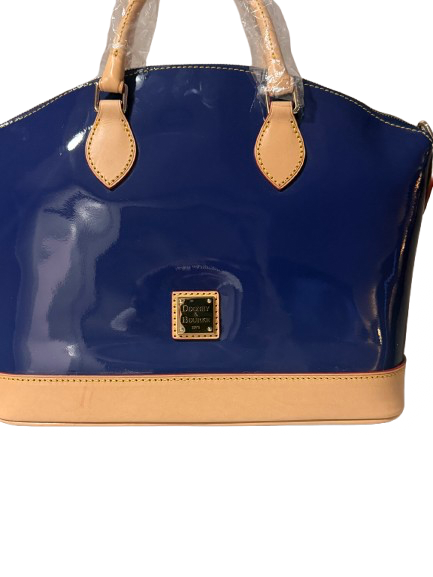 The Dooney & Bourke New Blue Dome Bag offers a sophisticated blend of patent and Vachetta leather, ensuring durability and elegance. Measuring 15x11 inches, it features a crossbody strap for versatile carrying options and includes a dust bag for protection. This bag is brand new with tags, providing a pristine addition to any collection.
