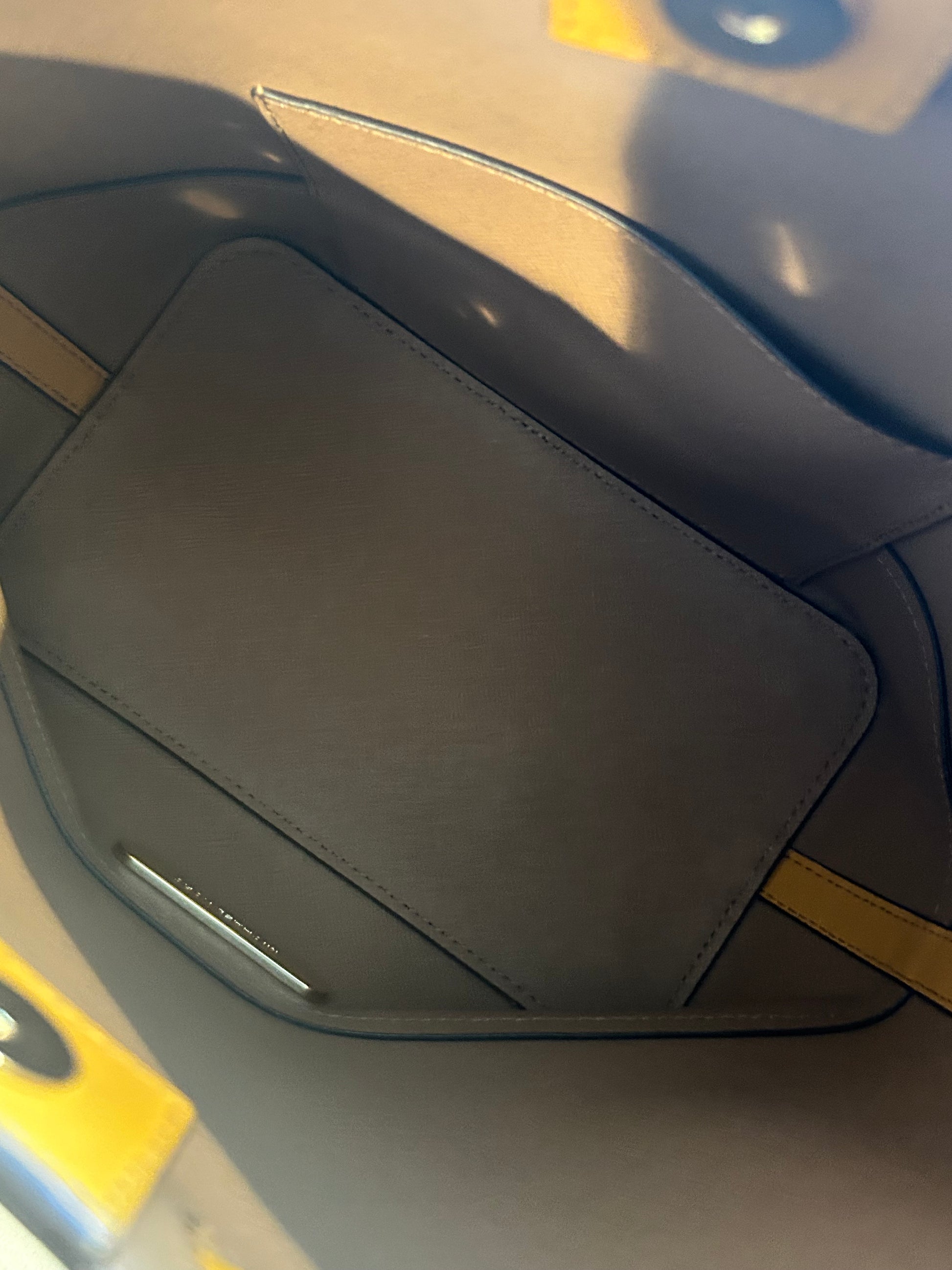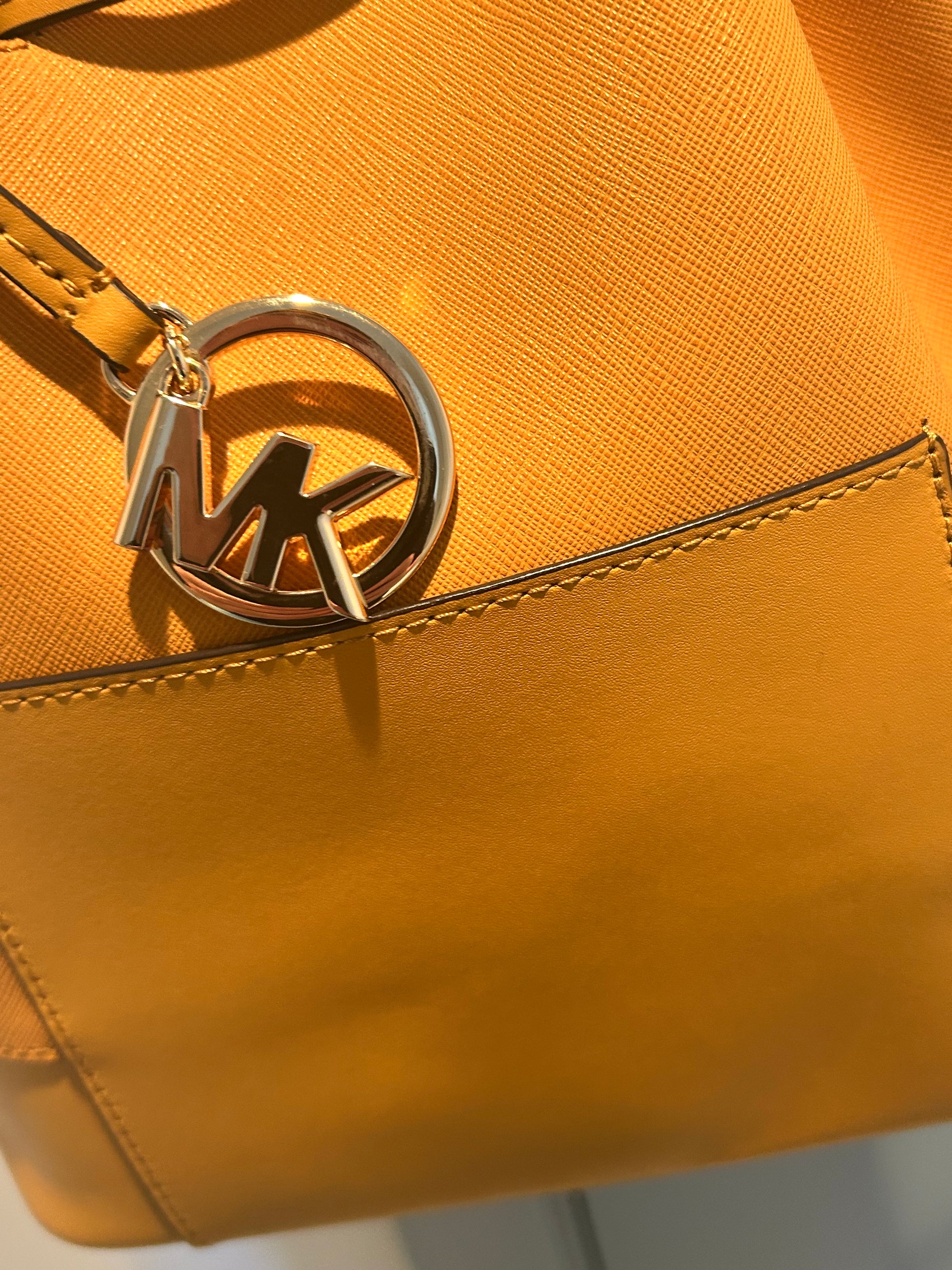 This Michael Kors Mustard Yellow Bucket Bag is the perfect accessory for summer with its trendy color and sleek design. It features a removable crossbody strap, feet on the bottom for added protection, and a back pocket for easy access to essentials. The MK charm adds a touch of elegance. Minor marks add character to this must-have bag.