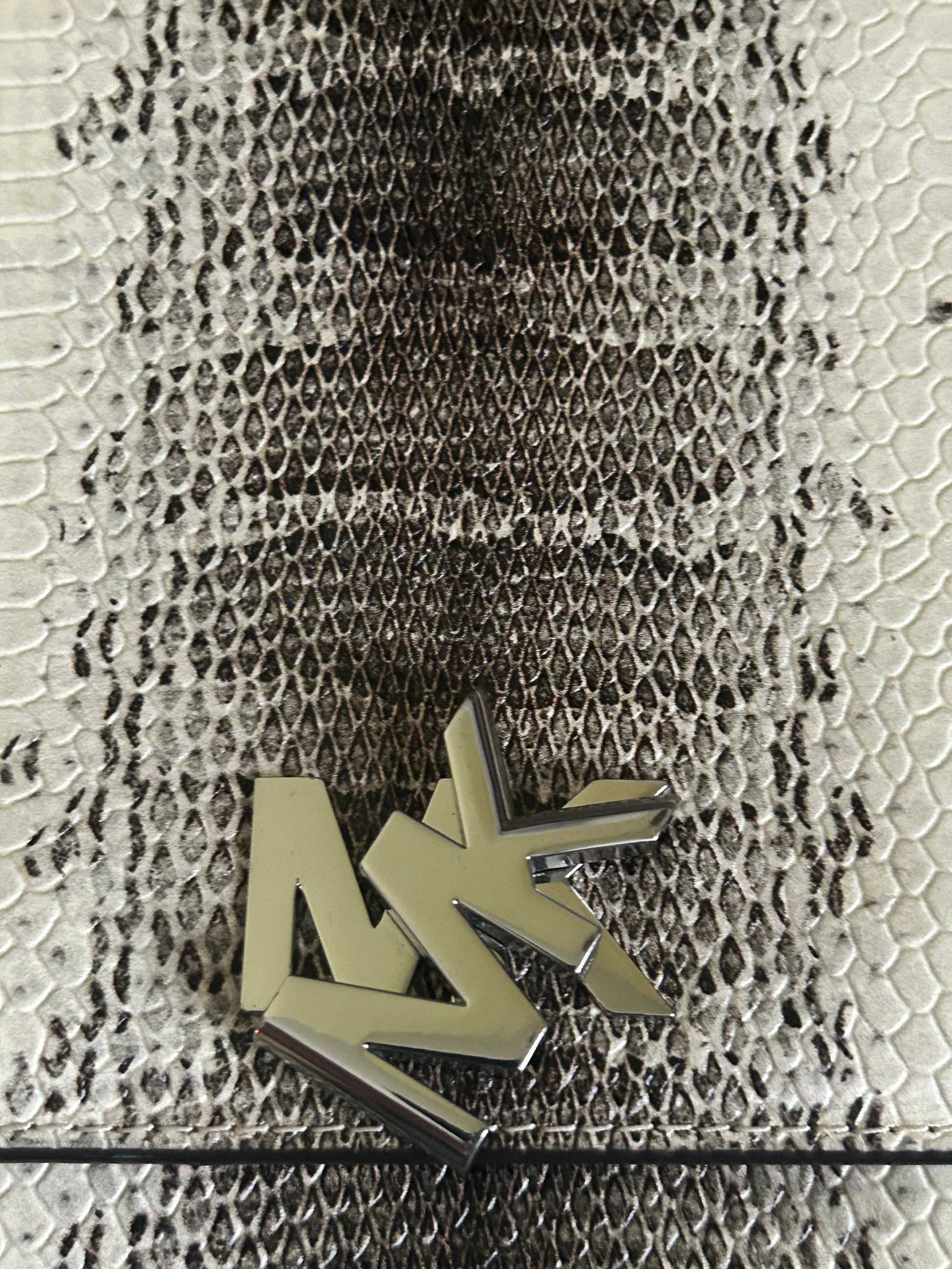 This unique Michael Kors Snake Skin Crossbody is the epitome of luxury and style. With beautiful chain detailing and silver hardware, it is the perfect accessory for any outfit. The included MK dust bag keeps it in pristine, like-new condition. Experience elegance and sophistication with its super unique clasp.